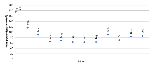 The maximum wind speed value is found in January with a value of 5.7 [m/s] and wind power density of 180 [W/m2 ].Figure 8 shows the results.