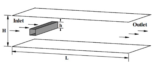 A square cylinder confined in a channel is simulated using different turbulence models to select the one that most approaches to literature results [17]. The influence of the mathematical simplifications and the SIMPLE algorithm is also analyzed. The domain used is shown in Figure 9.