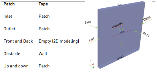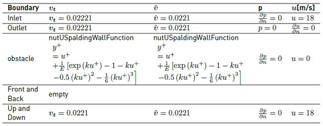 The fluid properties are incompressible flow, Re: 3 x 103, steady state, 2D and blockage ratio of 20%. A uniform velocity profile with a thin boundary layer thickness of 6% of channel height is necessary to replicate the case [17]. The boundary conditions used are the same as Table 4, modifying the initial values of the variables according to the fluid properties mentioned.