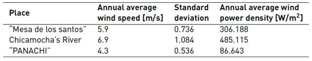 Table 6 summarizes the annual average wind speed and wind power density of the three locations. In brief, the feasible place for VAWT locations is at Chicamocha’s river due to its high average wind speed, 6.9 [m/s].