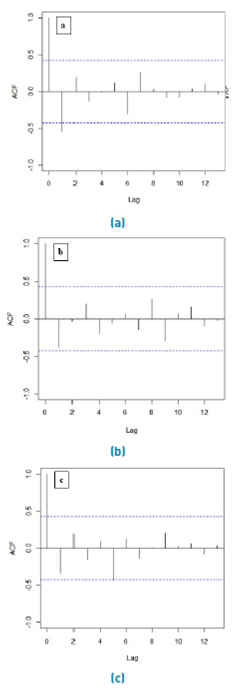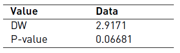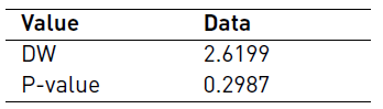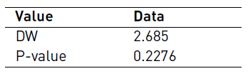 From Figure 10 can be inferred that the residuals do not present a correlation, as opposed to the first line, none of them exceeds the limits proposed by the discontinuous lines. To confirm this information, the Durbin-Watson independence test was carried out. The P-value [Table 14-16] is greater than the degree of significance α = 0.05, so it is confirmed that there is no correlation between residuals, that is to say, they are independent values in time.