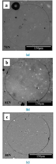 Figure 11 shows the formation of the complete damage ring cracking at a load range between 66 to 88 N, these cracks are within the range of normal chewing loads [14, 29]. At 66 N, sample A recorded the first completely damaged ring, whereas, under that load, the other formulations did not show this criterion. In none of the samples was there evidence of radial cracks, appreciable plastic deformation nor any superficial collapse of the material. Also, at the interface no cracks or damage was observed, indicating that this area is not a critical point of failure during contact loading. Finally, it was observed that the sample C is the one that presents a better behavior against the monotonic Hertzian contact.