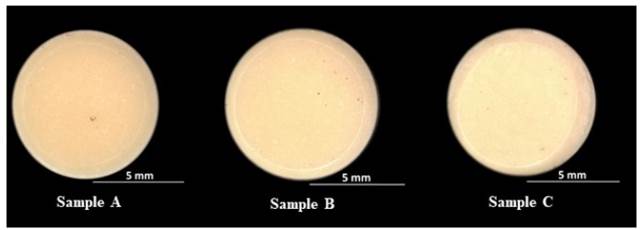 Figure 2 shows the visual characterization of the formulations after fabrication. A homogeneous coloration is observed over the entire surface and a minor change in translucency was observed with respect to the standard sample (Sample A) along with a porosity characteristic of this type of materials. This shows that the sonication method for the dispersion of the particles was effective in achieving a well dispersed material.
