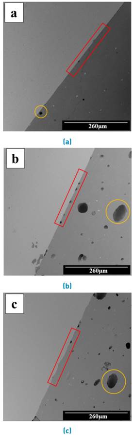 Figure 4 presents a series of SEM images collected from the porcelain cross-section. From this figure, it is possible to analyze the microstructure from 0 up to 2.5% (wt%) of Al2O3-3Y-TZP particles. The observations indicated the presence of 3Y-TZP, Al2O3 particles or leucite phases in white contrast and the amorphous phase in dark contrast [11]. It also shows the interface, showing a good adhesion between the veneering and the substrate (red box). A homogeneous distribution of the particles of Al2O3 and 3Y-TZP is observed, which means that there is no presence of agglomerates. In addition, the presence of porosity (circles) was found and it was greater than recorded by the standard sample.