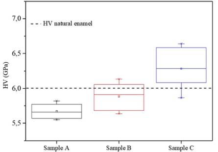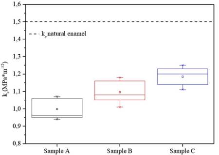 Figures 5-7 show the distribution of Vickers hardness, Young´s modulus and fracture toughness. These figures are a visual representation that describes the important characteristics of dispersion and symmetry in a data collection. The samples with addition of reinforcing agent present a statistically significant difference with respect to the fracture toughness and to the Young´s modulus of the VITA-VM9, although there is no significant difference with respect to the hardness.