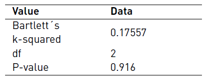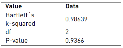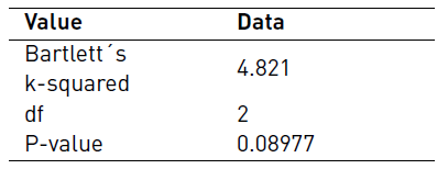Figure 9 shows that the data have a good dispersion which may indicate that the variance is constant. This information is confirmed statistically by the Bartlett test whose results are reported in the Tables 11-13. In this case the P-value is greater than the significance level α=0.05, therefore homoscedasticity is fulfilled.