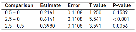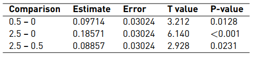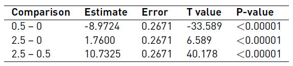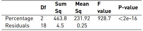 In order to evaluate the influence of the amount of reinforcing agent on the hardness, Young´s modulus and fracture toughness, an unifactorial analysis through ANOVA for the alumina factor was carried out by using the R commander software. A comparison was made for each of the levels (0, 0.5 and 2.5, with 0 being the VITA-VM9 sample), as shown in tables 5-7. Establishing a significance level (α) of 0.05 and since the P-value of the percentage factor is less than the significance level, it was observed that the hardness, Young´s modulus and fracture toughness are strongly influenced by the amount of reinforcing agent added.