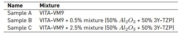 The porcelain powder VITA-VM9 was mixed with Alumina (Al2O3) 99.8% pure and Zirconia particles (3Y-TZP) (Tosoh, Japan) at two percentages of 0.5 and 2.5%, having equal parts of both components; the detailed composition of the mixtures are shown in Table 2. The composite mixture only by VITA-VM9 corresponds to the standard sample (A).
