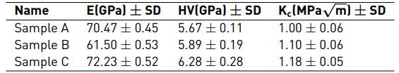 where E is Young´s modulus (GPa), HV is Vickers hardness (GPa), F the indentation load (N), L is the mean length of the diagonals (m) and C is the length of the cracks (m).
