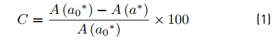 Where A(a0*) corresponds to the initial coordinate of each experiment. This value is theoretical and is considered as a reference area, defined by the rectangle of length tf (final time of exposure, 5 h) and height a0* (coordinate a* at t0, initial time of the test). At the same time, A(a*) is defined as the area under the curve a*(t) between t0 and tf, as mentioned above. The smaller the areas represent the higher the discoloration of the pigment in the specimens. This effect is attributed to physical and/or chemical phenomena, including photocatalysis, photolysis, thermolysis, among others [11]. In this case, the values of A(a*) were calculated using the trapezium method. It is noted that materials containing photocatalysts will have an accelerated decrease of A(a*) when irradiated; a product of the synergistic effect of photocatalytic processes and other mechanisms cited. In order to differentiate the photocatalytic activity from other phenomena that participate in the discoloration process in the samples, it was determined a photocatalytic activity coefficient (Γ), based on previous works [11, 29, 30]. It is defined in Equation (2):