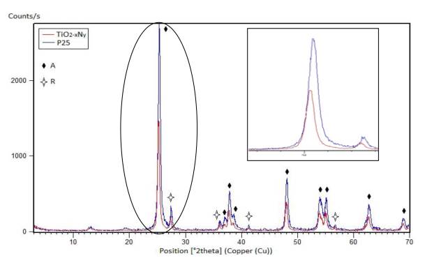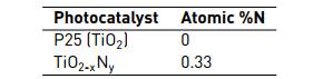 Table 1 shows the results of atomic percentage of nitrogen (CHN analysis) for the evaluated nanoparticles. The atomic percentage of nitrogen is necessary, in order to determine the dopant degree of the TiO2-xNy.