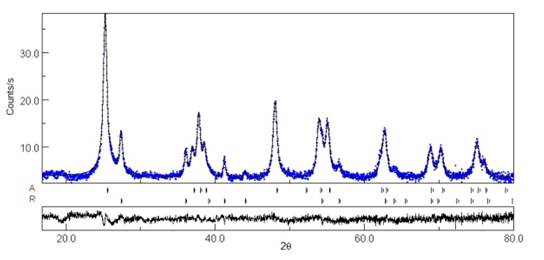 Rietveld refinement was performed by using the software MAUD (Materials Analysis Using Diffraction) [21]. Crystallographic data of anatase and rutile were taken from COD (Crystallographic Open Database) [22]. The diffuse reflectance UV-vis spectra (DRS) were recorded at room temperature using a Thermo Scientific EVOLUTION 600 spectrophotometer equipped with an integrating sphere and BaSO4 was used as a reference. The band gap of TiO2 and TiO2-xNy was calculated by using the Kubelka-Munk (K-M) transformed function. CHN (Carbon, hydrogen and nitrogen) analysis was carried out on a Truspec LECO CHN analyzer.