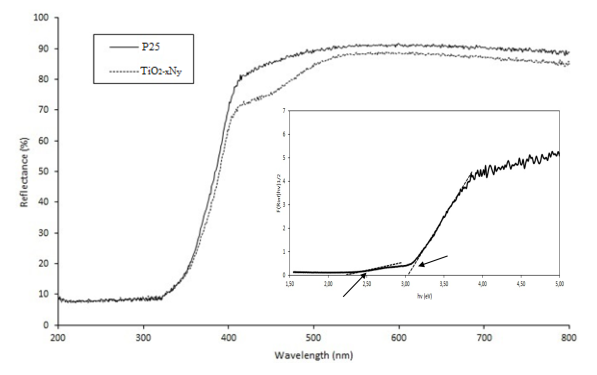 Figure 3 shows the diffuse reflectance UV-vis spectra of P25 (TiO2) and TiO2-xNy. It can be observed that titanium oxynitride presented an increased absorption between 400 and 510 nm, in comparison to TiO2. This evidence suggests that nitride ion is able to modify the optical properties of TiO2, as reported in other works [13, 14]. The band gap of the nanoparticles was calculated using the reflectance data with the transformed K-M function (F(Rinf)hv)1/2), as presented in the plot inset of Figure 3. The band gap values obtained for TiO2 and TiO2-xNy were 3.1 eV and 3.02 eV respectively. Additionally, a second absorption edge was observed in the inset plot at 2.25 eV (550 nm), which could be attributed to the presence of an energy band located above the valence band that induces the visible light activity as reported by other authors [18].