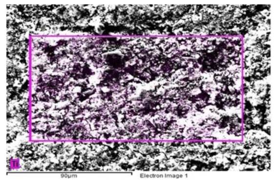 Figure 4 shows an SEM micrograph with EDS of Portland cement blended with 3% of TiO2-xNy. The selected area shows in purple color the location of the titanium from nanoparticles in the surface of the cementitious matrix. It is noted that the distribution of the nanoparticles in the samples is quite uniform for a 3% concentration of admixture; therefore, there is an increased probability of it being involved in the photocatalytic reactions.