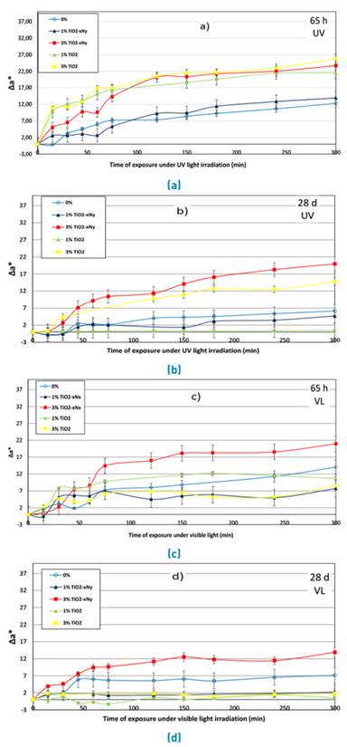 The discoloration of the specimens was followed by the decrease of the coordinate a* which represents the concentration of the dye. The Commission Internationale de l’Eclairage [26] specify a color order system in coordinates where L* represents the brightness, a* the hues from green to red, and b* the hues from blue to yellow. In this case, the Rhodamine B is a reddish hue represented by positives values of the coordinate a*. Figure 5 corresponds to the change in Δa* (a0* - at*) from an initial coordinate (a0*) until a coordinate with a time of exposure defined as (at*). Additionally, the discoloration is represented by an increase of Δa* after a period of time under light irradiation. Figure 5a, shows the abatement of Rhodamine B in the samples under UV irradiation and curing time of 65 hours. The increase of the nanoparticles in the specimens improve the photoactivity, similarly to reported by some authors [11, 12]. In the same way, the results showed that TiO2-xNy and TiO2 have a similar photocatalytic activity under UV irradiation. In order to exclude other phenomena as photolysis in the specimens, control samples were evaluated to the same conditions. Moreover, Figure 5c shows the behavior of the samples after 65 hours of curing age, under visible light irradiation. The results were quite different with respect to UV light. P25 did not show photoactivity in visible light, possibly to the fact that only can be activated by wavelengths localized in the UVA radiation. In the same way, the highest content of TiO2-xNy (3%) showed better results for the disappearance rate of Rhodamine B under visible light, confirming the data observed in Figure 3.