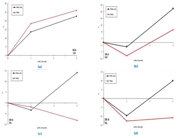 Figures 5b and 5d correspond to the results obtained after 28 days of curing age. The specimens showed a loss of photoactivity, which can be associated to the formation of hydrated products from the cement around the nanoparticles and a densification of the matrix, which decreases the amount of light that can enter the cement paste. Despite this, the titanium oxynitride showed better results than TiO2 even under UV light irradiation, according to Figure 5b. This phenomenon is possibly due to the fact that TiO2-xNy has the ability to capture photons of lower energy as a product of the collision with hydrated products of the cement and calcite. Similar to the results with visible light after 65 hours of curing age, titanium oxynitride obtained a better efficiency in comparison to that of TiO2 under visible light irradiation, especially to higher percentages of addition.