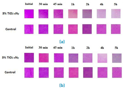 The gradual degradation of the dye is illustrated in the photos shown in Figure 7. Specimens with 3% of TiO2-xNy showed a higher self-cleaning property under UV-vis irradiation with respect to the control samples (0%).