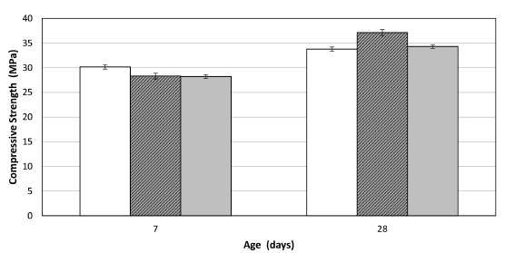 A compressive strength test of cement mortars of 50 mm was performed according to the ASTM C109 standard [25]. Two sets of samples were prepared with 3% of TiO2 and TiO2-xNy respectively, and a third set as a control sample was used. The mortars were fabricated using a water/binder ratio of 0.485 and sand/cement ratio of 2.75. The tests were performed after 7 and 28 days of curing.