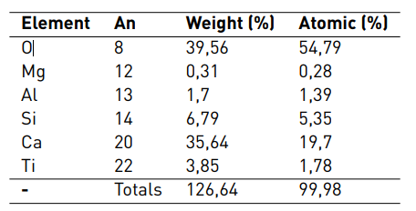EDS results of the sample of Portland blended with 3% of TiO2-xNy are shown in Table 2. A significant percentage of nanoparticles in the surface represented by the content of Ti can be observed.