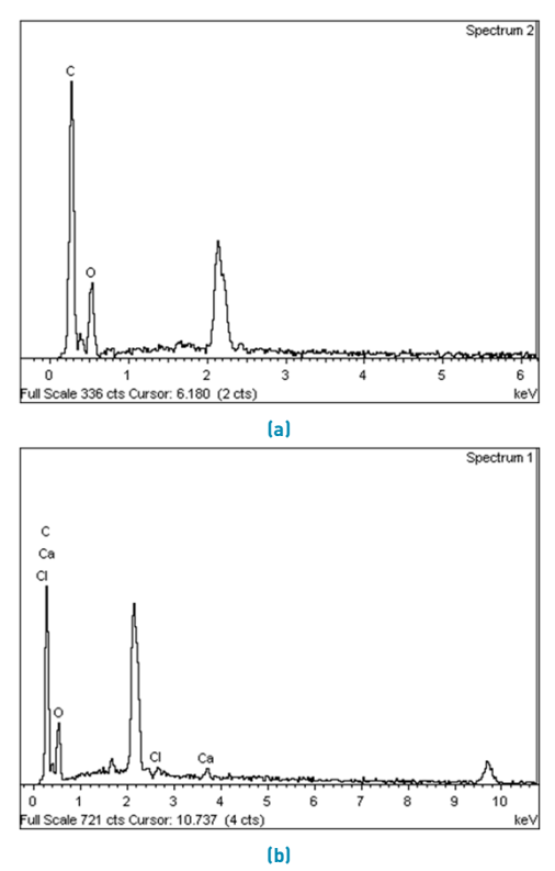 In Figure 2, EDS spectra obtained after dialysis during different timings are shown. Those patterns correspond to the solution dialyzed using (new) dialysis tubing, but represent the behavior of all the other samples. For the solution treated with 7 days of dialysis [Figure 2a), there are peaks corresponding only to carbon and oxygen, which are commonly associated with materials with a protein-like composition [25]. On the other hand, for the solution treated for 5 days [Figure 2b) there are not only peaks of carbon and oxygen, but also traces of calcium and chlorine, showing that 5 days is not enough time for efficient salts removal.