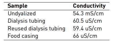 Conductivity measurements were executed after the solutions were dialyzed, taking the undialyzed one as the control sample, as a method to evaluate the dialysis efficiency. A lower conductivity measurement implies a lower ion concentration of the salts in the solution.