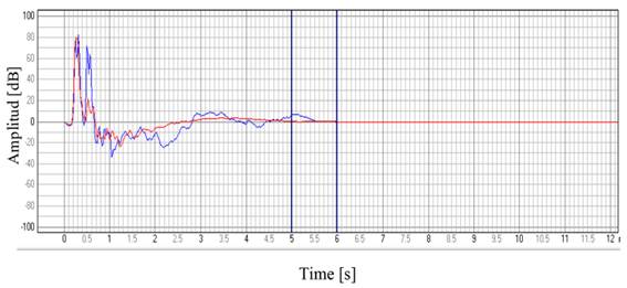 After locating the microphones positions and connecting the measurement system, the software configuration and calibration in the Easera acoustic measurement software, is performed. For this, a 2-channel input and 1-channel output configuration is set, and afterwards, the pistonphone is calibrated to 94 dB SPL. A measurement of the background noise is performed, following normative recommendations. This normative states that the measurement signal must be at 45 dB above of the background noise. However, the background noise registered a 58 dB level; therefore, it is adjusted to the output level until it gets a 103 dB level.