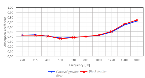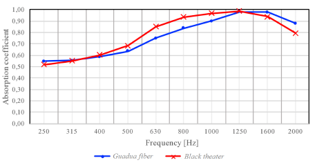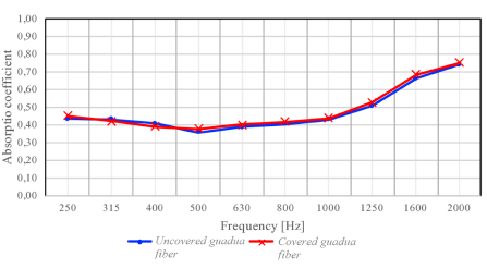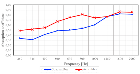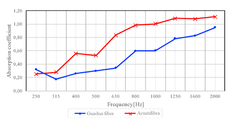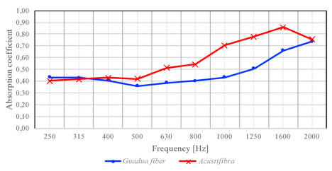 The Figure 22 describes the absorption coefficients of the guadua fibre and the acustifibra, in which the parallel behaviour between both materials is observed. It is worth to mention the proportional increase of the absorption coefficient with respect to frequency. However, greater absorption coefficients are noted because of the acustifibra, except from the 1,250 Hz band, for which the absorption is equivalent.