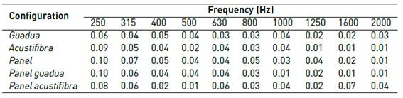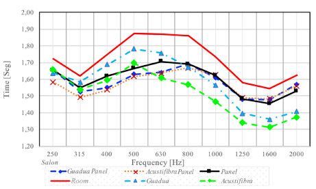 When modifying the room surfaces, introducing the different materials configurations, the reverberation time is changed, highlighting that, the variation of RT presented by the perforated panel is inferior, with exception of the 500 Hz band; here in this frequency band, the guadua fiber is slightly superior. On the other hand, the guadua fiber and the acustifibra configurations reduced to a great extent the RT, above the 1 kHz band (high-frequency). On the contrary, the panel/guadua and panel/acustifibra configurations present a greater reduction at low frequencies (until 500 Hz).