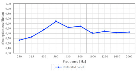 With the aim of having a wide frequency spectrum, a perforated panel was designed at middle/low frequency and as it was previously described, the resonant frequency to which the panel is tuned is 476 Hz. Consequently, the Figure 19 presents the absorption coefficient of this panel, and as it was expected maximum absorption at the 500 Hz frequency band is achieved.