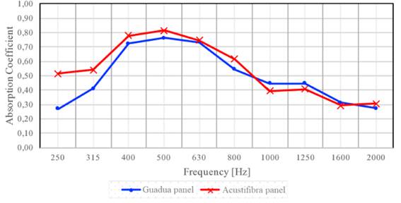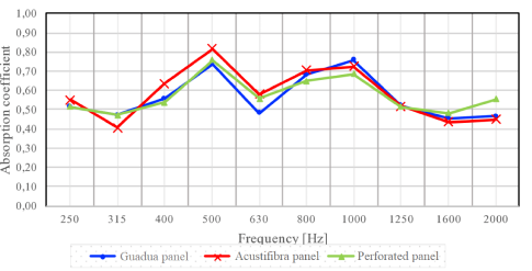 It may be highlighted that, if the behaviour of both configurations, generally, is similar, the configuration with acustifibra filling has superior absorption coefficients with respect to the guadua fiber panel, with except from the 1 kHz and 1,250 Hz bands. However, those configurations present a significant difference in absorption in the 250 Hz and 315 Hz bands.