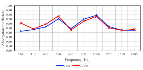 The absorption coefficient above 1,000 Hz increases due to the fact that the internal cavities of the material, its porosity and internal configuration makes it more efficient from this frequency. The largest amount of energy is dissipated beginning from this frequency.