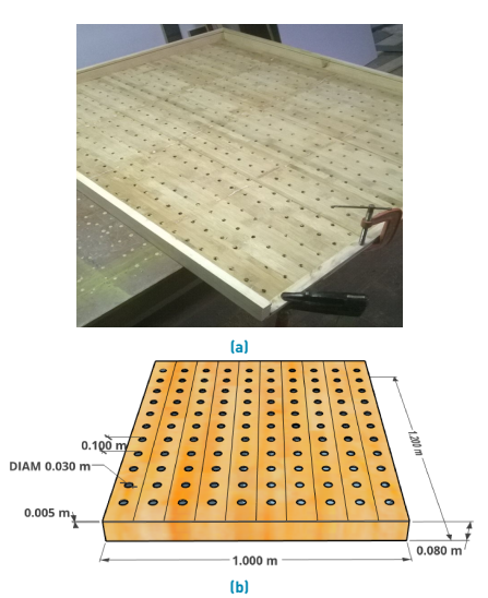 For the construction of the perforated panel, 10 tables of guadua were used, which were pressed to obtain a final laminate of 1.2 m length by 1 m width, with a thickness oscillating between 0.3 cm and 0.6 cm, obtaining an average thickness of 0.5 cm. It is worthy to clarify that a series of tables with the same dimensions is cumbersome to obtain, therefore the absorption coefficient will be affected because of the irregularities of the plate. The obtained sheet was placed onto a MDF wood structure as can be seen in Figure 3, and afterwards the opening of the perforations followed, corresponding to the chosen design. Consequently, a sealing system of the air cavity was implemented, through a triplex wood sheet, which is removable, facilitating the change of the filling material composed of guadua fibers. Finally, the panel was revised once again, in order to seal any hole that does not belong to the original system.