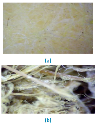 In this research, a comparison between the performances of panels made of acustifibra (fiber-glass) and guadua is made. In the Figure 4, taken with an electronic microscope, the structural differences between them can be seen. When the inner structure of the fiber is dense, then the inner paths which are generated inside the fiber are smaller, which blocks air flux movement, generating dissipation, increasing material temperature.