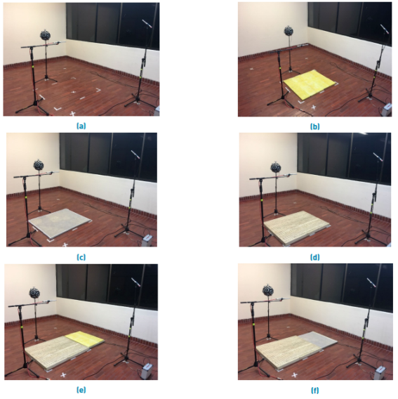 Afterwards, the reverberation time of the empty room is measured with the Impulsive Response method [Figure 6]. This measurement will serve as a reference to determine the absorption coefficient of the implemented samples. After this, the reverberation time is measured, placing the different sample combinations: acustifibra, guadua fiber, perforated panel, acustifibra panel, and guadua fiber panel, as it can be observed in the Figure 7.