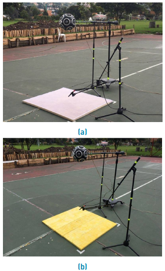 Analogously to the reverberation time measurement, system configuration and electroacoustic calibration are performed. The measurement of the background noise registered a 64 dB level and consequently, the source level was adjusted until 109 dB level, approximately. The measurements of the impulse response were held at free space, with the aim of minimizing the parasite reflections presence in the measurement. For this, the same configurations of materials implemented for the reverberation time, placing the samples over the floor (plane and rigid surface), in order to capture the reflection in an optimal manner [Fig. 8]. The loudspeaker-microphone array was positioned in the center and perpendicular to the samples, locating the loudspeaker at 1.10 m and the microphone at 10, 20 and 30 cm from the ground respectively. Measurement process is shown in Figure 8.