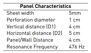 Resonant frequency fo of the perforated panel and the other mentioned variables and distances are related. When the distance between holes and/or distance to the rigid wall increases, then fo decreases. If the radius of the holes increases, then fo also. The values of the resonant frequency and the sheet thickness have been fixed; for the determination of the leftover panel measures, an error and trial procedure is adopted. Afterwards, panel perforations are done with drill, so available broach sizes in the market are taking into account. Table 1 summarizes panel dimensions. From the experimentation with different variables, the most optimal dimensions for the panel design have a resonant frequency of 476 Hz.