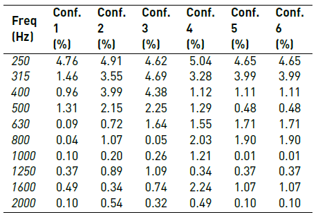 The Figure 17 presents the reverberation times (RT) measured according to the protocols stipulated in the ISO 3382-2 normative. As it was expected, the empty room has longer reverberation times: these are used as reference for the calculation of acoustic absorption.