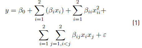 The second-order regression model resulting from the ANOVA test is described by Equation (2).