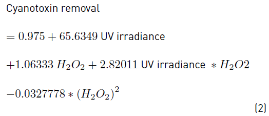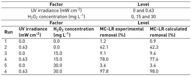 For the implementation of the UV/H2O2 system, a multilevel factorial DOE was performed. For this purpose, the UV irradiance and the H2O2 content were considered as main factors and were evaluated at 2 (0 and 0.63 mW cm-2) and 3 (0, 15 and 30 mg L-1) levels, respectively. The response variable was the removal percentage of MC-LR at 30 min of treatment, in order to discern their optimal working conditions and to examine the effects of the two controllable variables selected for studying the efficiency of the system. In Table 3, the DOE matrix composed of 6 runs executed randomly, and the levels of the considered factors are listed. Additionally, the experimental and calculated removal percentages of MC-LR cyanotoxin are reported.