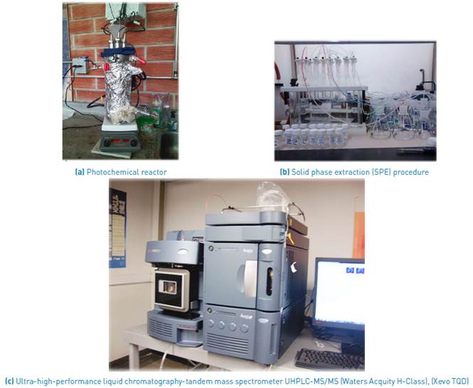 A 2 L effective capacity jacketed photochemical reactor with 4 germicidal low pressure lamps emitting mainly at 254 nm with 0.63 mW cm-2 irradiance, verified through a UVX radiometer (Upland, CA, USA), was used for the UV-radiation simulation. H2O2 was evaluated at 15 and 30 mg L-1concentration levels. The reaction solution temperature was kept stable with the external refrigeration jacket. Homogeneity was kept through continuous agitation at 260 rpm. Before starting the experiments, the UV lamps were warmed up for 30 min to ensure stable emission. Samples were spiked with 20 µg L-1 MC-LR. Aliquots of 100 mL were withdrawn at different time intervals during the oxidation treatment. In order to stop the action of H2O2, Na2SO3 was added immediately. Residual MC-LR in the reaction solution was analyzed through the SPE-UHPLC-MS/MS method previously described. In Figure 1, the experimental setup, composed of the photochemical reactor, the solid phase extraction (SPE) procedure and the ultra-high-performance liquid chromatography-tandem mass spectrometer, is illustrated.