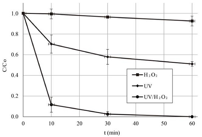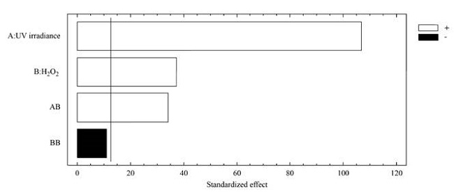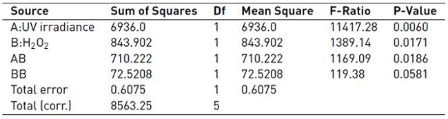 The effects of the oxidizing agent and the UV-radiation, in terms of UV irradiance, were evaluated using a multilevel factorial design of experiments (DOE), resulting in 6 runs, which were executed randomly. Every run was carried out in triplicate and average values were reported. Analysis of variance (ANOVA) test was conducted and a second-order regression model, described by Equation (1), was built