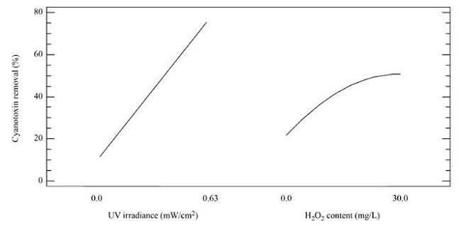 Keeping in view the facts mentioned above, MC-LR cyanotoxin removal efficiency using a UV/H2O2 system both in natural water and in distilled water was evaluated in the present work. For this purpose, different combinations of H2O2 initial concentration and UV irradiance were assessed using a multilevel factorial design of experiments with the aim of finding the optimal working conditions of the oxidation system to control the problem of MC-LR natural water pollution and, subsequently, to produce safe drinking water in compliance with all legally stipulated parameters for public consumption.