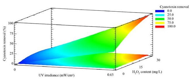 In order to tackle the problem of cyanotoxin pollution in water, previous studies suggest the application of advanced oxidation processes (AOPs). Among these, the combination of UV-radiation with an oxidizing agent such as hydrogen peroxide (H2O2) stands out as a viable solution for the remediation of water contaminated with cyanotoxins, by allowing the formation of the free hydroxyl radical (HO°), as a powerful oxidizing agent (E0=2.8 V) [8-12].