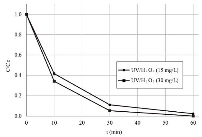 Natural water was also used to determine the efficiency of the oxidation process on removing MC-LR cyanotoxin at 0.63 mW cm-2 reducing the content of H2O2, as observed in Figure 6. Similar results were obtained by using 30 and 15 mg L-1 of H2O2; particularly, a removal of the target cyanotoxin of 99.59 and 98.08% were achieved, respectively, which were below the WHO recommended limit for MC-LR in drinking water. This indicates that the content of H2O2 for treating 20 µg L-1 of MC-LR cyanotoxin can be reduced by half, saving in operating costs. On the other hand, it is important to note that from the author’s knowledge, H2O2 residual concentration after applying the treatment under similar working conditions is reduced by about half with respect to the initial content. This fact, added to the unstable character of H2O2, as described by Equation (9), leads to the necessity of using an additional disinfection agent to guarantee water disinfection when it is not consumed immediately.