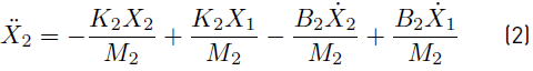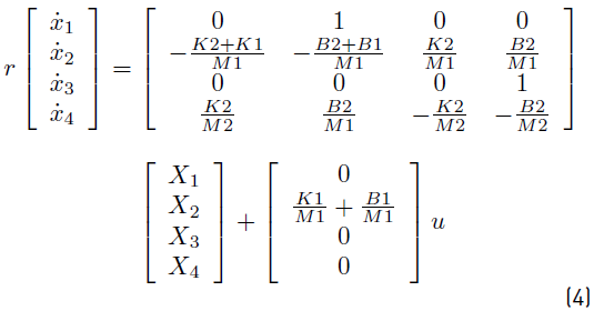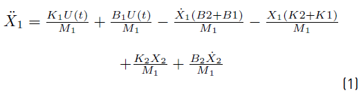 The equations of motion for the dynamic system shown in Figure 1 are detailed down below. An initial analysis of free body was carried out. Then, the state variables of the system are declared to establish their derivatives depending on said variables as well as the system input (U). Equation (1) represents the vertical displacement of the center of mass of the carrier (X1) and Equation (2) represents the vertical displacement of the center of mass of the load (X2). K denotes the suspension stiffness and B denotes the suspension damping. Based on the previous equations, the equation of state of the dynamic system is defined as seen in Equation (3). After replacing Equations (1) and (2), Equation (4) is obtained.