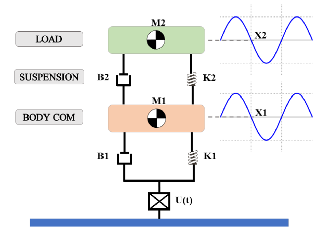 The vertical displacement of the COM of a person while walking can be approximated to a sinusoid with fixed frequency and amplitude [9]. To determine the suspension values of the load carriage system, the two-degree-of-freedom theoretical model proposed by [10] was used since the simulation results were strongly correlated with the experimental measurements. The model simulates the vertical displacement of the centers of mass of the carrier and the load, as illustrated in Figure 1. The model helps to determine the optimum coupling of the load (mass 2 denoted M2) with the COM of the carrier (mass 1 denoted M1). The model shows reduced peaks in the resulting forces and a reduction in energy consumption while walking.