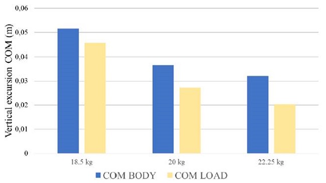 Movement during walking is the product of forces or energy transfers that originate intrinsically and extrinsically. The Center of Mass (COM) of the body during walking, is characterized by having a non-rectilinear movement, yet it describes vertical and horizontal displacements, which lead to an increased metabolic expenditure. To improve gait performance, energy transfers are produced. The amplitude of the vertical displacement of the soldier COM while walking is close to 5-7 cm and is reflected in the military backpack thus describing a similar vertical displacement [4]. Said displacement results in an increase of the acceleration forces generated by the action of the load on the body. These forces can reach up to twice of those imposed by static weight, due to the acceleration of added masses. This causes a considerable increase in energy expenditure for the soldier carrying the load [6].