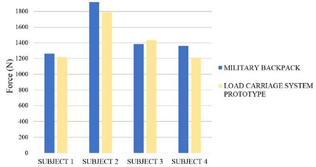 On average, the prototype showed a decrease in the maximum forces acting on the carrier going from 1269.9 N to 1193.7 N compared to the conventional military backpack, as shown in Table 2. Three out of the four subjects saw a decline in the maximum strength related to the TVGRF when using the prototype, as shown in Figure 12.