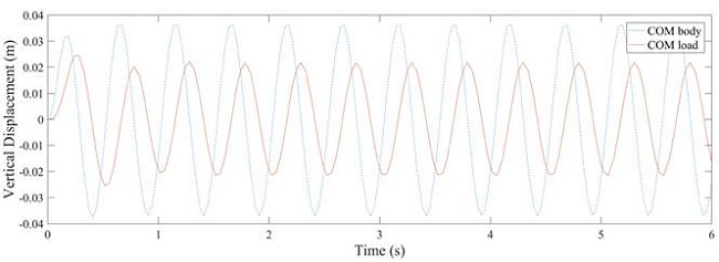 The values of parameters M1 (main mass), K1 (rigidity of the leg), and B1 (cushioning of the leg) are approximations to the values of an average human being. The oscillation amplitude of the actuator of the leg has a fixed value. The model has the same values as those used by [10], who conclude that the energy expenditure is reduced when the natural frequency of load suspension (Wd ) is much lower than the walking frequency (Wf ) as seen in Equation (5), because of its behavior as a vibration isolator. Hence, the movement of the load is decoupled from the movement of the body's COM during the act of walking.