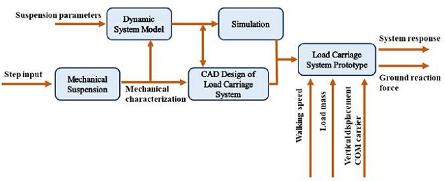 In this research, a load carriage system with mechanical suspension was designed to reduce the vertical excursion of the COM of the load. The requirements of Colombian infantry soldiers are considered while maintaining a simple and economical design. The objective of the project was to develop a load carriage system with load suspension that reduces the vertical displacement of the backpack, thereby diminishing the acceleration forces acting on the soldier, in order to reduce the acceleration forces. The mechanical suspension of the system was simulated, a CAD model was designed, and a prototype version of the load carriage system was subsequently implemented. Experimental tests were carried out to validate the performance of the developed prototype and a pilot test was performed on Colombian military forces to assess the effect of the load carriage system in terms of kinetic parameters.